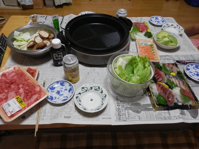 更にお刺身もパックのままだし、焼肉で汚れないように、テーブルには新聞紙・・・・・