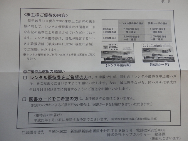 で、この会社の決算時に300株以上保有している株主は、図書カード(1000円分)か、レンタル券(2000円分)を選択してもらう事ができます。