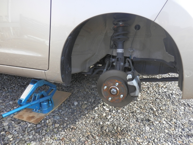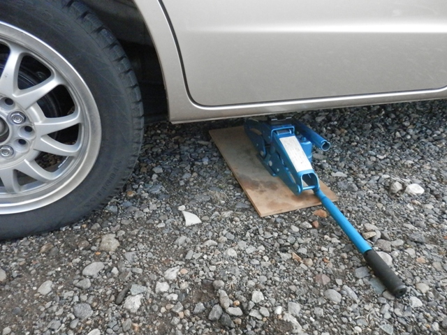 うちの駐車場は砂利敷きなので、ジャッキが沈まないように下に板をあててっと・・・
