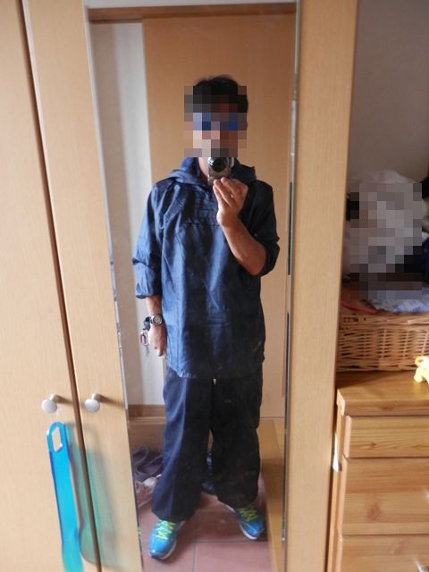 作業着に着替え、鏡越しに自分を撮影・・・orz