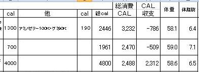 しかし、この表の中で1ヶ月の摂取カロリー合計と消費カロリー合計の差が7200Kcal以上あるのに減っていない時がある。(その又逆もある)