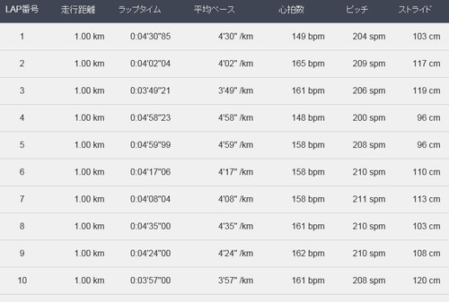 こんな感じのランになりました。(←各ラップの平均ピッチ&ストライドも表示)