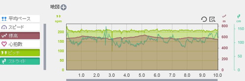 で、5km折り返し後は、7kmまで緩やかに下りますので、再びピッチもストライドも上がり、8kmの上り坂区間は、割と必死に走ったので、ピッチは維持していたものの、坂の分だけストライドが落ちていました。