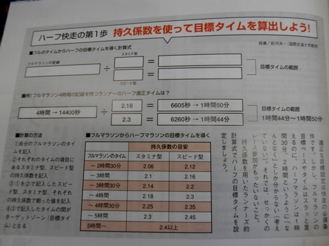 記事によると、フルマラソンのタイムから計算して、ハーフの目標タイムが出るという単純な算式。