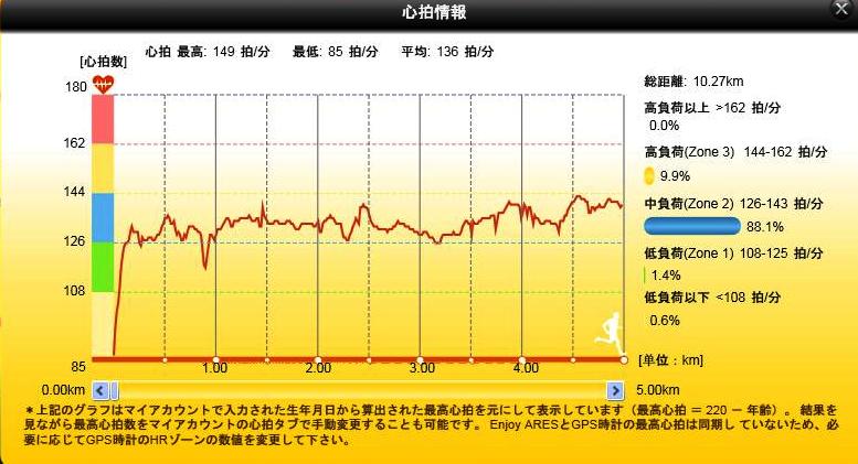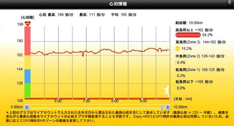 しかも、走り始めからペースを上げてますので、心臓が落ち着くまで2km程かかり、それまではかなり心拍数が乱れてます。