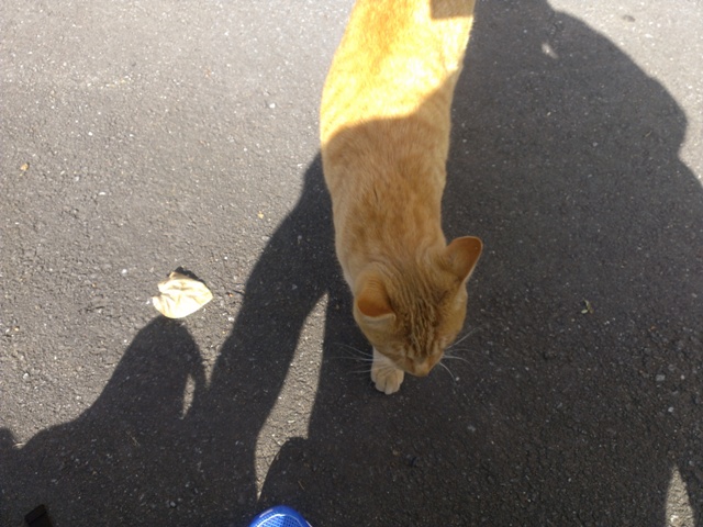 人懐っこい猫で、ここに来ると必ずよってきます。野良にしては、まるまると太ってますし、まぁまぁキレイになっているので、たぶん飼われていると推測されます。