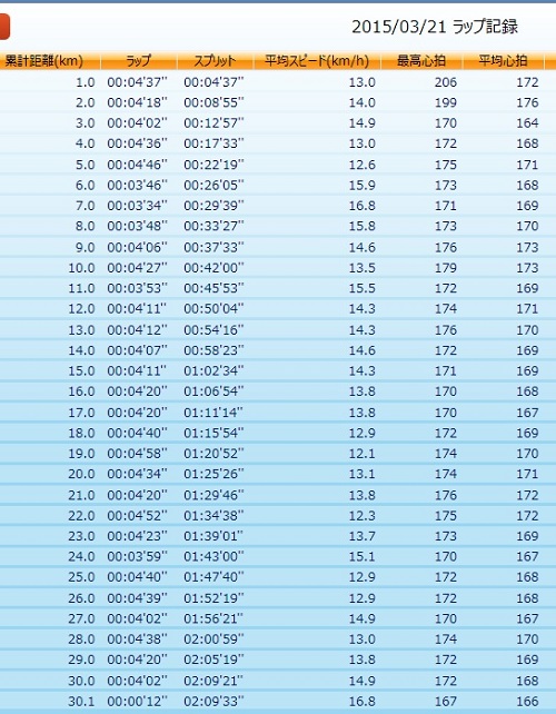 30km通過は、2時間09分21秒と、予定を大幅に短縮して走り切ることができました。