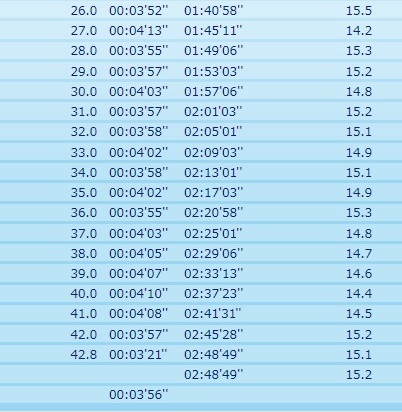 こうして振り返ってみても、大崩れしなかったことと、前半のアップダウンの中でも4分15秒を超えるような遅いタイムがなかった事が、勝因だと感じています。