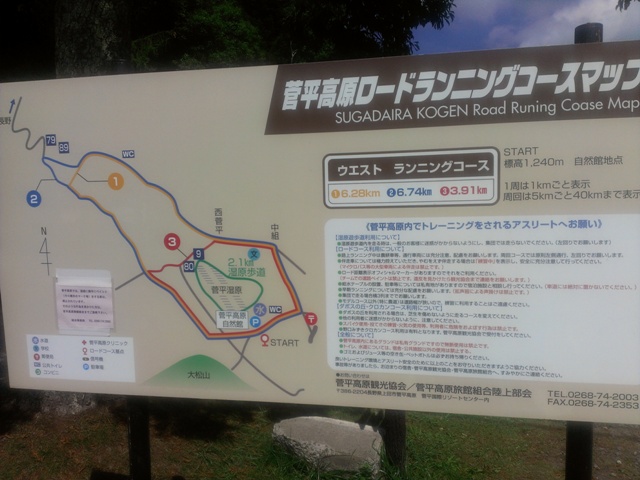 菅平は、「ランニングコース」とうたっているだけあって、走りやすい良いコースです。同じ順路でも3種類の距離がありますから、うまく組み合わせれば、いろんな距離に対応できますし、周回路ですから車を拠点に走れるのは大きな魅力。(ここを給水スポットに出来る)