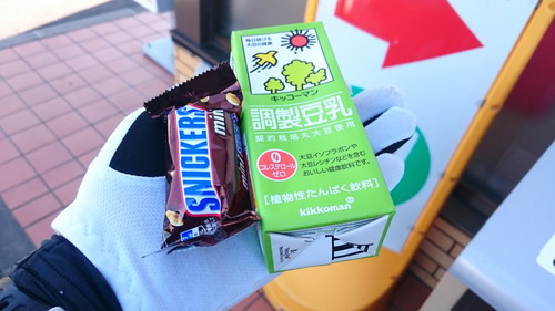 スニッカーズのミニ(←この小ささで100kcalもある、普段は食っちゃいけない代物w)を食べ、豆乳でタンパク質と水分をW補給。