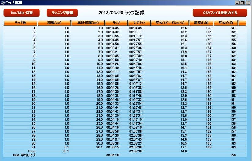 30.14km走って、2時間15分59秒でした。