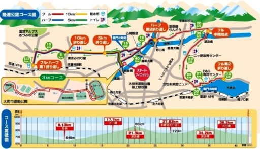 大町は、いきなり下り坂からスタートし、8km地点で折り返したら延々と上り、21km地点の最高地点までいったら木崎湖まで一気に下り、また折り返して登ってくる(笑)