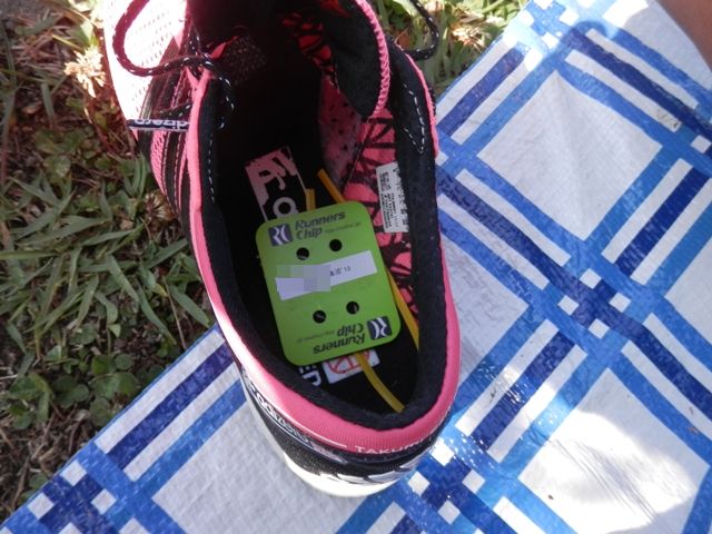 さ、そろそろ開会式も始まりそうなので、レースウェアに着替え、シューズを履いて、記録計測用の「チップ」を足につけようとします・・・・・