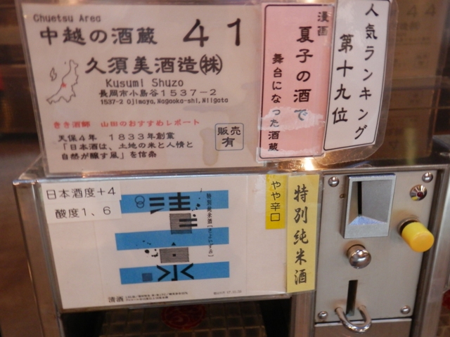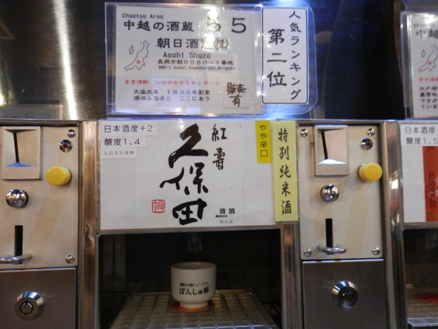 500円を店の方に支払うと、利き酒用のおちょことコイン5枚が手渡されます。で、このコインを飲みたいお酒の出てくる機械に投入すると、おちょこ1杯分のお酒が注がれるというシステムになっています。(つまり、おちょこ1杯100円っていうことですね♪)