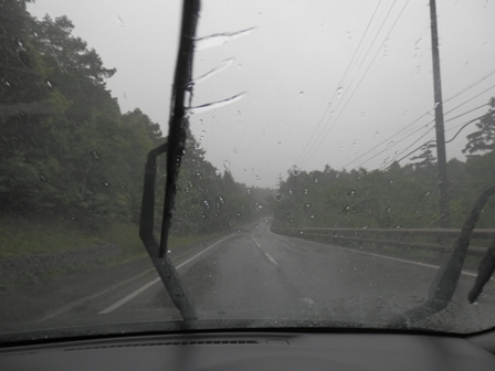 あまりのショックに、運転そっちのけでウィンドウ越しの雨模様を撮影。ヾ(゚Д゚ )ォィォィ