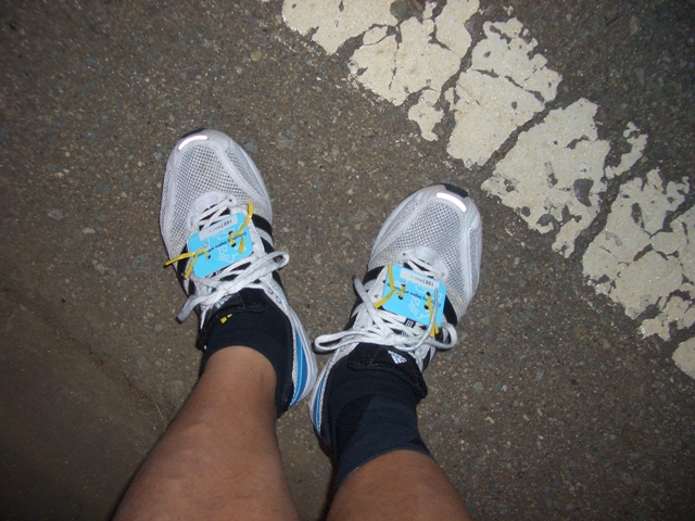 今回の大会は、記録計測に「ランナーズチップ」というICチップを使って計測します。ただ、普通は、1個だけつけるのに、なぜかここでは2個つけるように言われ、両足にチップを装着します。
