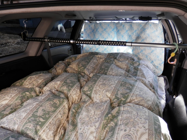 自分の車のラゲッジルームを「カプセルホテル」に改造し、準備万端の出発です。