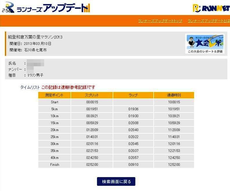 2013年3月 能登和倉万葉の里マラソン 2時間52分00秒