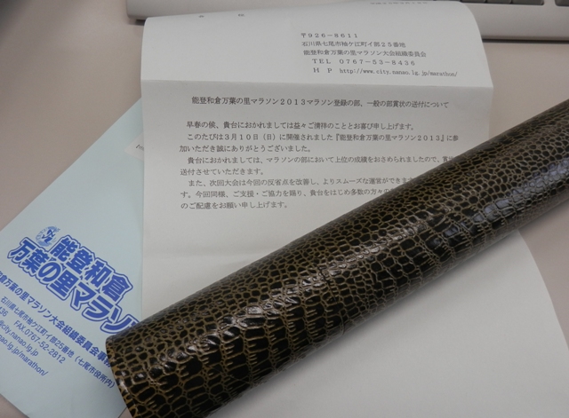 賞状は、昨年5月のハーフマラソンで4位入賞で頂いたのに続く2枚目!