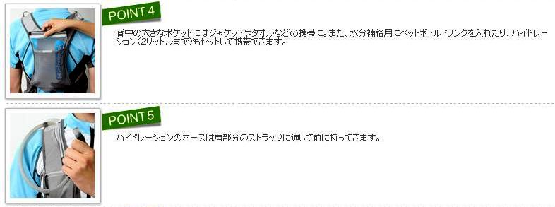 ちなみに「ハイドレーションシステム」とは、飲み口となるホースがつながった「ウォーターバック」のことで、簡単に言うと、ポリ袋の中に入った水などの液体をストロー代わりのホースを使って、いつでも飲むことができる給水システムのことで、給水のない「トレイルレース」や、給水間隔の長いウルトラマラソンなどでは、使う方も多いシステムです。