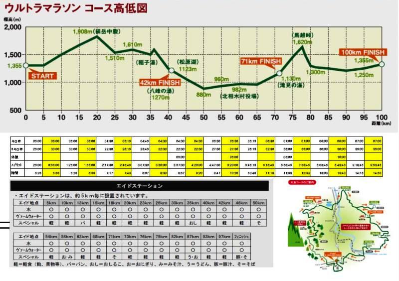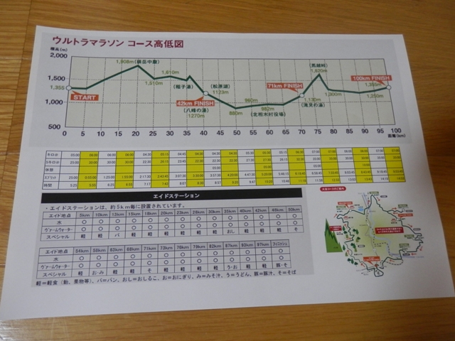 で、表の上から「高低図」と「予想ラップ表」、そして「エイドステーション一覧」と、「コース略図」を掲載しています。