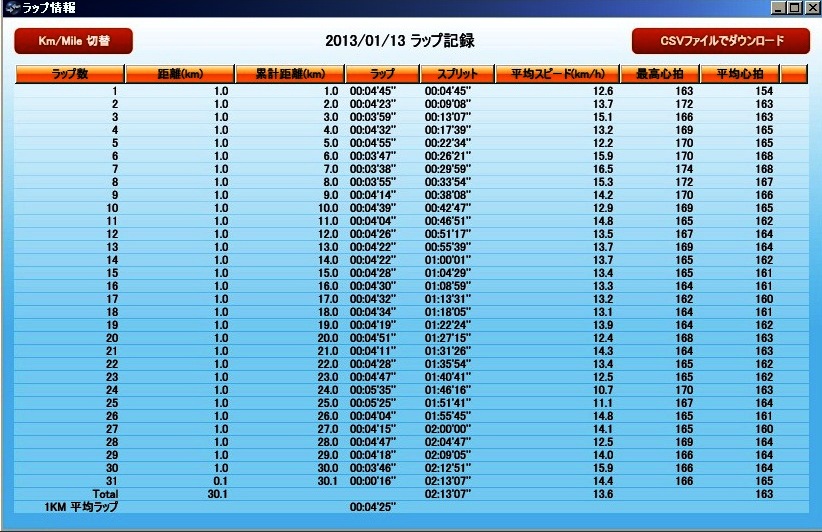 本日のラン 30.06km 2時間13分07秒
