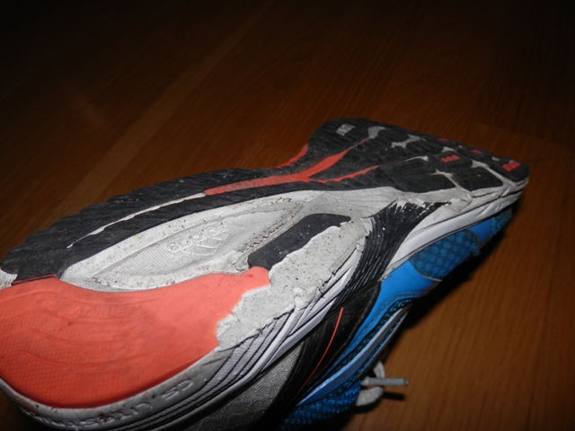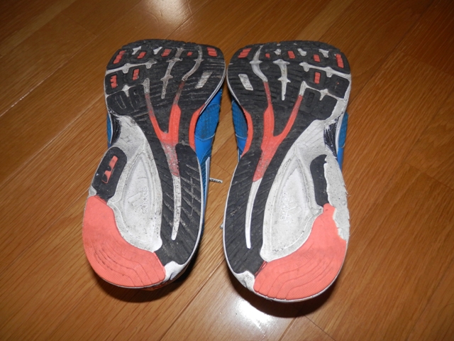 レーシングシューズなので、レースに4戦出場(いずれもハーフ)した後、練習用として二軍落ち。その後、ペース走のトレーニングシューズとして数百キロ履いたところで、ソールがボロボロになり、使用が限界を迎えました。
