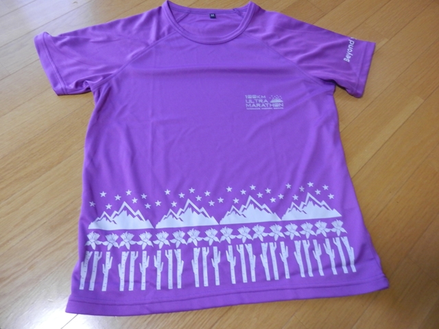 胸にきらめく「100KM ULTRA MARATHON」の文字が眩しい、デザインいまいちな参加賞Tシャツです(笑)