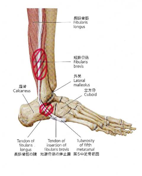 で、上の大きい〇部分が「腓骨筋」(短腓骨筋 OR 長腓骨筋のどちらなのかは、ちょっとあいまいw)ですが、基本的にここは慢性的な疲労を抱えやすく、筋肉痛も頻繁です。