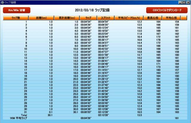 相変わらずのアップダウンコースなので、平均ラップを4分30秒/Km、トータル2時間15分以内で30km走れれば、とりあえず合格です。