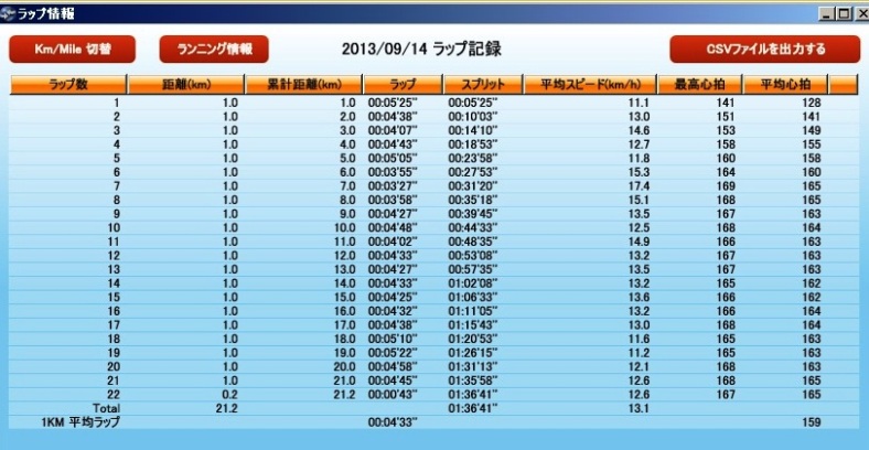 本日のラン 21.15km 1時間36分41秒