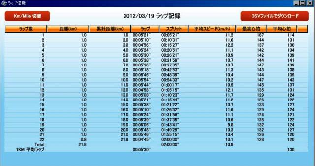 14Km地点で変なオートラップ機能が働いていますが、30Kmちょっとを2時間20分で走破。