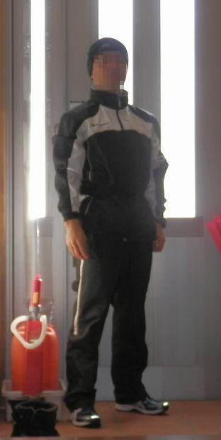 黒のニット帽の下に黒のネックウォーマー(フェイスマスクにもなる優れもの)。そして黒のウィンドブレーカー上下着用にスキー用の分厚い手袋をはめ、全体的に「もっさり」した感じ。