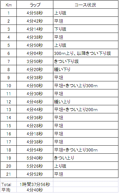 そんなこんなで、なんとか21Kmを走り終えた後に早速タイムを書きだし、コース状況を踏まえた上で反省会を実施!