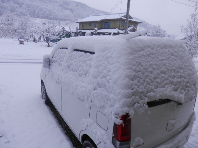 内陸に位置する長野の里では、雪の日の方が暖かい。今朝の気温はマイナス1度。