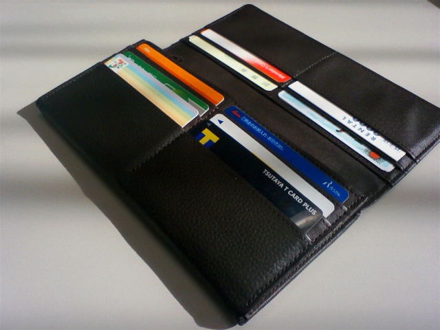 財布はノン・ブランドですが、スタンダードな使いやすさと本革製の作りが合格。だいたい、中身より高い財布なんて買えません(-_-メ)