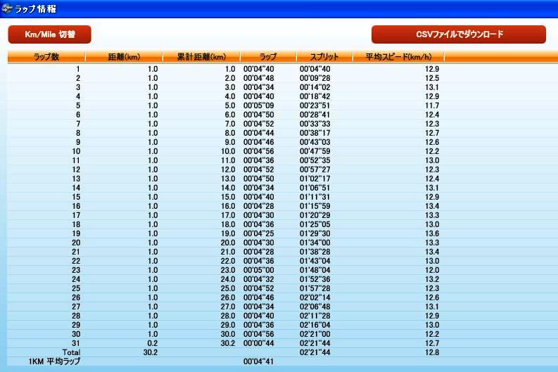 現在のサブ3.5(フル3時間半以内)から3.15(フル3時間15分以内)にランクアップする為にも、先ずは平均ラップ4分30秒で30Km走が目標です。