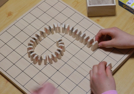 リビングを覗くと娘が将棋盤に向かって一人何かをやっています。