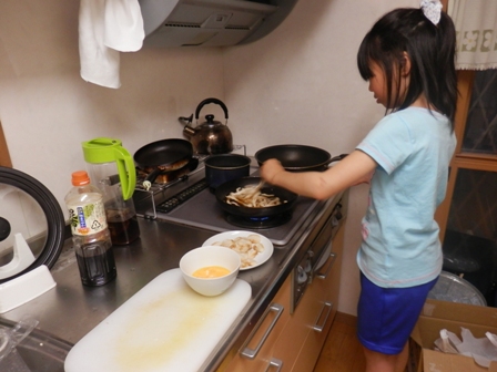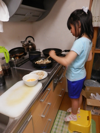 身長が足りないので、台に乗って炒めます。