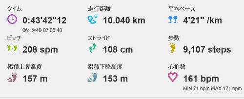 ここからは流しで良かったんですが、そもそも序盤の「ガチ」があまりガチらしくなかったので、流しよりは少しペースを上げ、距離はいつもの10kmでランを継続しました。