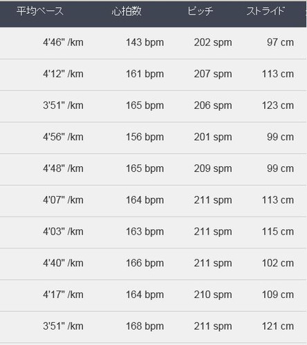 こんな感じのランになりました。(←各ラップの平均ピッチ&ストライドも表示)