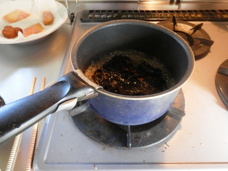 続いて、本当は油でひじきを炒める様ですが、ヘルシーに仕上げる為、「テフロン加工」の力を信じて、油無しでサッと炒めて、麺つゆを適当にΣ(゚д゚) エッ!?投入し中火でしばらくグツグツと・・・・・・(2~3分くらい)