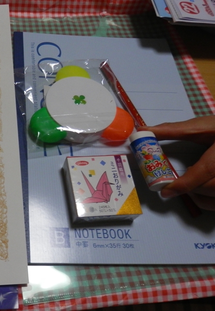 ま、中身は『ノートに赤鉛筆と消しゴムとよくある文具に加え、「謎の筆記具(なんか丸いやつに3つのイボがついたやつ)」そして、ミニ折り紙』と微妙なラインアップ(笑)