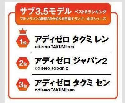 雑誌「ランニングマガジン・クリール」でアンケートをやった、「サブ3.5」でのベストシューズランキングの結果のパネル。