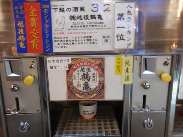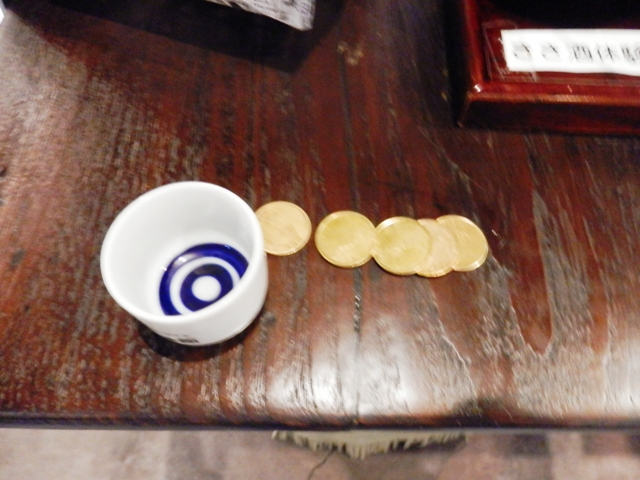 500円を店の方に支払うと、利き酒用のおちょことコイン5枚が手渡されます。で、このコインを飲みたいお酒の出てくる機械に投入すると、おちょこ1杯分のお酒が注がれるというシステムになっています。(つまり、おちょこ1杯100円っていうことですね♪)
