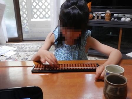 リビングで娘が、ばあばからそろばんの特訓を受けてます。
