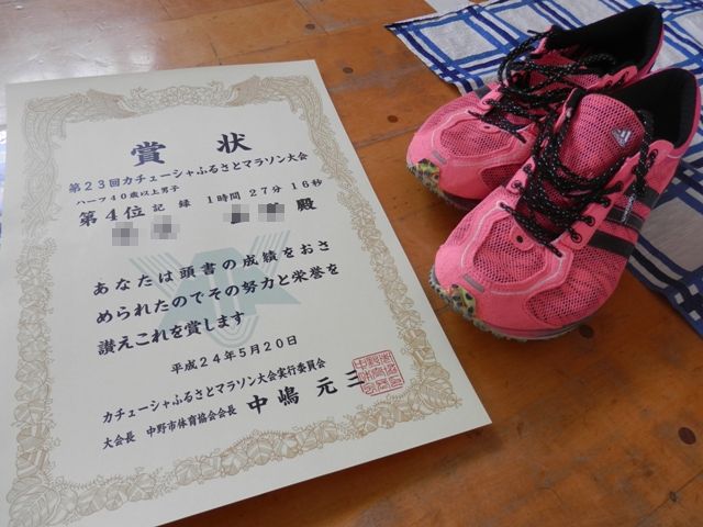 なんと、ハーフの40歳以上の部(おっさんの部)で、4位入賞です。