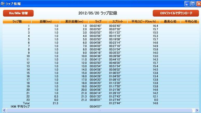 コースレイアウトの特徴通り、後半が特に厳しいタイムになってしまいました。ラップ表の通り15Km以降では、4分20秒以下のタイムが続き、ラストの上り坂では5分近くになってしまいました。