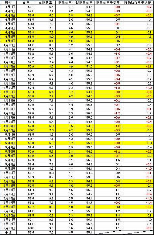 本来の体重は、除脂肪体重平均の55Kgにゴールデンウィーク前までの平均脂肪量4Kgを足した59Kgが平均体重。これに対し、GW以降は、平均脂肪量が5Kgに増加し、55Kgの除脂肪体重と足すと60Kgと言うことになります。