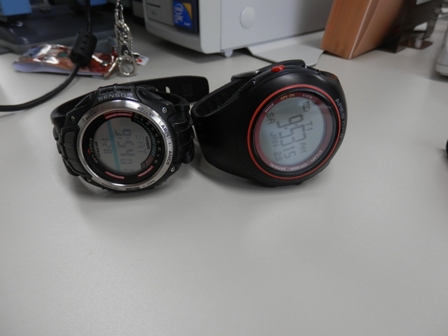 もう一つのランニングウォッチと比べると赤いボタンがついてる方がARESです。左側の時計もランニングウォッチとしては、ごつい方ですが、それよりも分厚いボディー